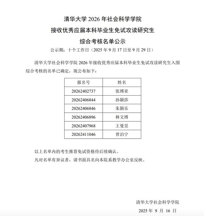 9月16日,清华大学2026年社会科学学院接收优秀应届本科毕业生免试攻读研究生综合考核名单公示,中国乒乓球队运动员孙颖莎、王曼昱等在列。