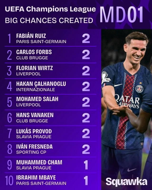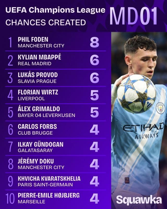 9月19日讯 欧冠首轮已经完赛,数据机构squakwa也统计了首轮的创造机会和创造重大机会情况。福登以8次创造机会居首。