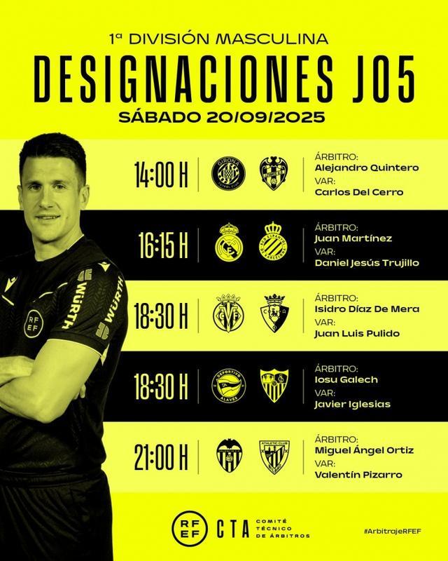 9月19日讯 西甲官方更新社媒动态,公布了9月20日多场第5轮比赛的裁判安排。
