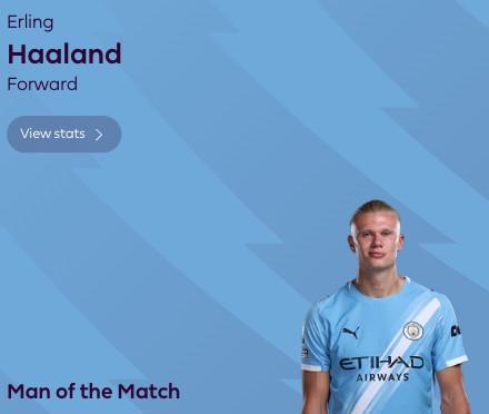 最终经过英超官网的球迷投票,哈兰德以83%的得票率当选全场最佳球员。