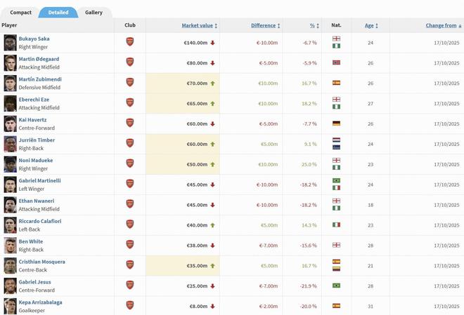 北京时间10月17日,德转更新了英超球员身价,阿森纳身价变动球员如下。