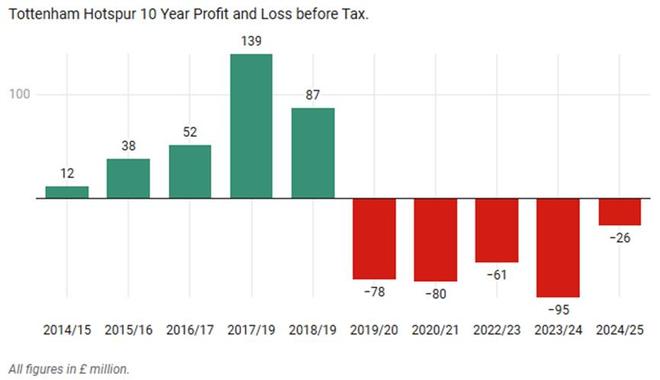 热刺2025年最新发布的财报显示,在2023-2024赛季,球队净债务(债务-现金及等价物=净债务)从7.7亿欧元(63.49亿人民币)扩张到了8.8亿(72.40亿人民币)欧元。营收方面,热刺连续两个赛季均录得净亏损,总计达1.25亿欧元(10.31亿人民币)。